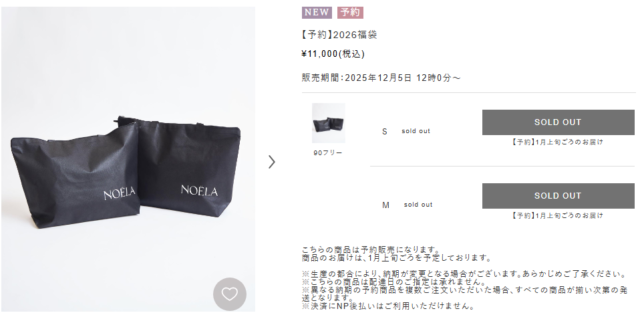 2026年ノエラ(noela)の福袋の予約日程ですが、12月12日金曜日12時~だと予想されます。