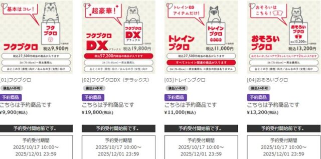 | トレインブクロ | ¥11,000 | 約¥27,500相当 | トレイン柄のアイテムが中心 | トレインアイテム限定 |